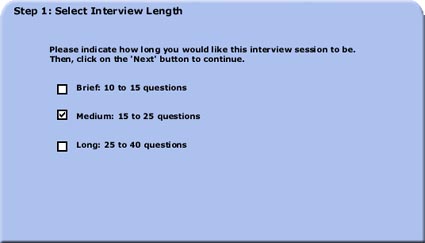 Step 1: Select the length of interview you would like to experience. You can select a short, medium, or long interview. Click on 'Next' to continue.