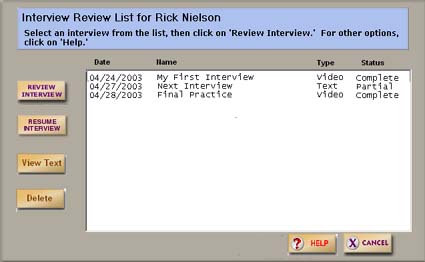 Use the buttons located along the left side of the window to manage your saved interviews.