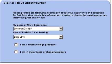 Step 3: Indicate your years of work experience, and the type of position you are seeking. Perfect Interview will use this information to determine which interview questions will be presented.