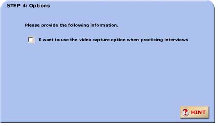 Step 4: You can use the optional web cam to record your responses to the interview questions. If the camera is installed on your system and you want to use it, check 'I want to use the video capture option'. Otherwise, leave this box unchecked.
